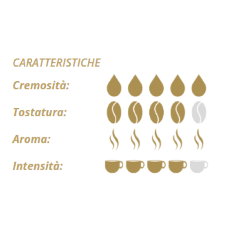 In questa miscela c'è tutto l'inconfondibile gusto di un espresso forte e deciso dall'aroma pieno e fragrante dal corpo ricco. Cremosità persistente e ben compatta.