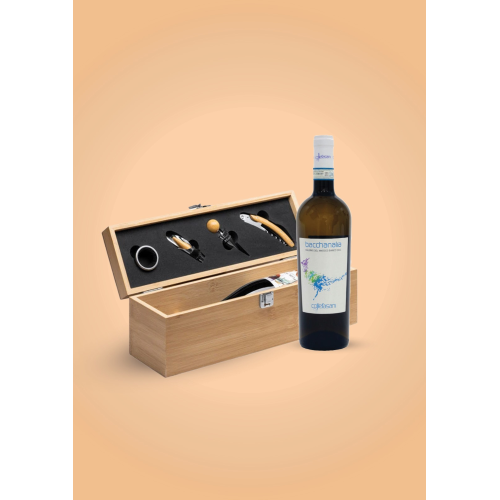 CONFANETTO IN LEGNO CON KIT ACCESSORI VINO IN ACCIAIO INOX CON BOTTIGLIA DI VINO BACCHANALIA FALERNO DEL MASSICO BIANCO DOC 75 ML -COLLE FASANI