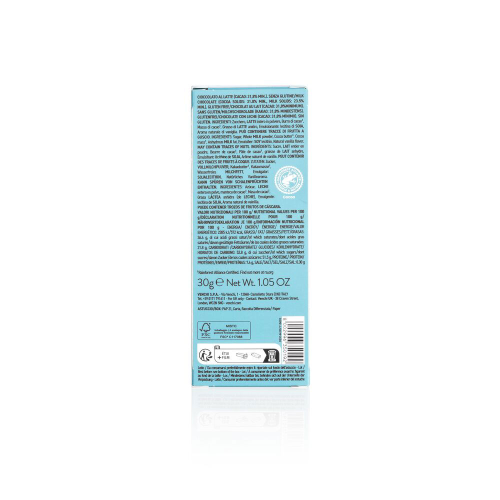 Ingredienti: CIOCCOLATO AL LATTE (CACAO: 31,8% MIN.). SENZA GLUTINE INGREDIENTI: Zucchero, LATTE intero in polvere, Burro di cacao, Massa di cacao, Grasso di LATTE anidro, Emulsionante: lecitina di SOIA, Aroma naturale di vaniglia. PUÒ CONTENERE TRACCE DI FRUTTA A GUSCIO.
