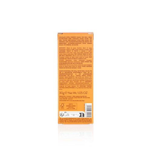 Ideale per gli amanti del fondente equilibrato, questa tavoletta offre una percentuale intermedia di cacao, garantendo un gusto deciso senza eccessiva amarezza. Il bilanciamento perfetto tra cacao e zucchero esalta le note fruttate e speziate dolci del cioccolato, rendendolo apprezzabile da un'ampia varietà di palati. Perfetta da gustare in abbinamento al caffè, tè alla frutta, vini rossi e passiti, succhi di frutta.INGREDIENTI: CIOCCOLATO EXTRA FONDENTE (CACAO: 70% MIN.). SENZA GLUTINE INGREDIENTI: Massa di cacao, Zucchero, Burro di cacao, Emulsionante: lecitina di SOIA, Aroma naturale di vaniglia. PUÒ CONTENERE TRACCE DI FRUTTA A GUSCIO E LATTE