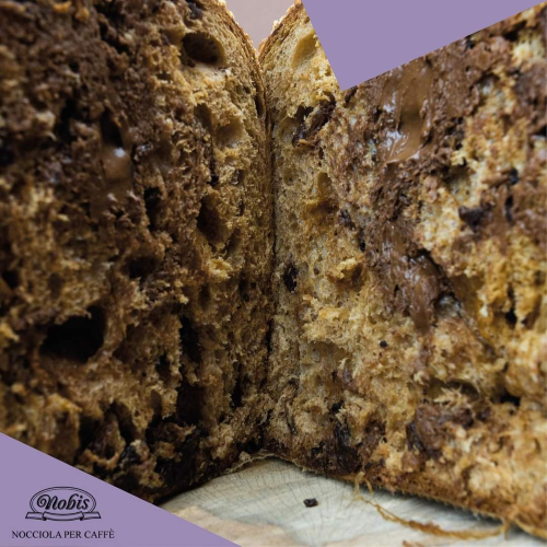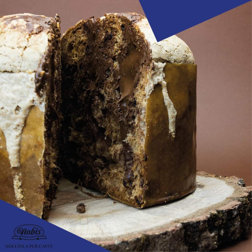 Soffice Panettone artigianale, a lievitazione naturale, ricoperto di finissimo cioccolato al latte e pregiate Nocciole di Giffoni, farcito con le nostre creme.